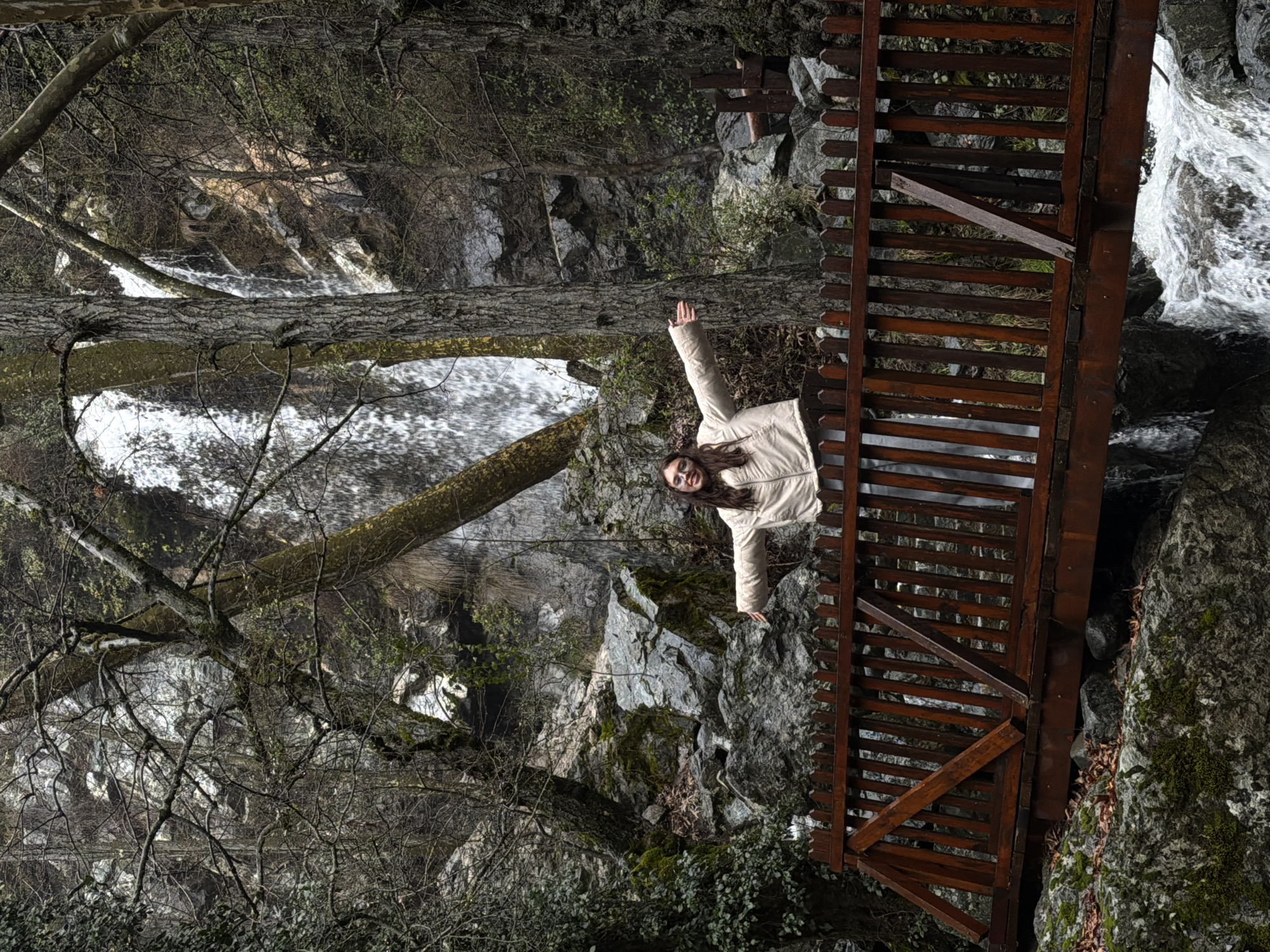 A full shot of a woman standing on a bridge over a waterfall, taken at an angle. The image is rotated 180 degrees, giving the impression the woman is upside down. The woman has long, brown hair and is wearing a light-colored jacket. She is standing on a wooden bridge with a horizontal slat design. One arm is raised. To the left of the bridge, a waterfall cascades over rocks. Trees with bare branches and green moss are visible along the surrounding landscape. The scene depicts the location of Milomeris Waterfall at Pano Platres, Cyprus.