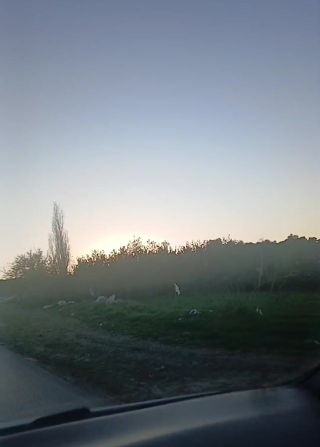 view from inside a car driving on a narrow paved road. The camera is looking forward and up, capturing the road ahead, a grassy shoulder with some shrubs and trees, and the sky. The sky is light blue, tinged with orange where the sun is rising or setting behind the trees. The road curves gently uphill. There is a single tall, thin tree standing prominently on the roadside. The lighting is soft and the scene has a tranquil feel.