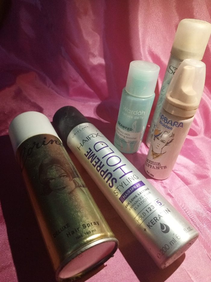 collection of hair and skin care products arranged on a pink fabric background. There is a gold-colored hair spray can labeled "DELUXE Hair Spray" with a vintage woman's image. Adjacent to it is a silver hairspray can, "HairX SUPREME HOLD STYLING HAIRSPRAY", containing keratin for enhanced hair elasticity. Behind them is a blue bottle of "Wardah nature daily SEAWEED" skin hydrating booster. Lastly, there are two mousse/hair spray bottles in the background. One is "Barbara Walden MOUSSE DIFFANTE" and the other is partially obscured.