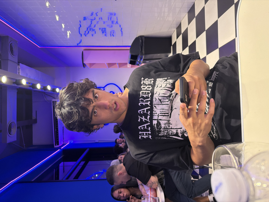 A man with curly brown hair wearing a black t-shirt that says "HAZARDOUS" holds a phone and looks towards the camera with an exaggerated expression. He appears to be in a restaurant with blue neon lighting. Behind him, there are other people seated at tables. The ceiling has a black and white checkered pattern. There are glasses and other dining items on the table in front of him.