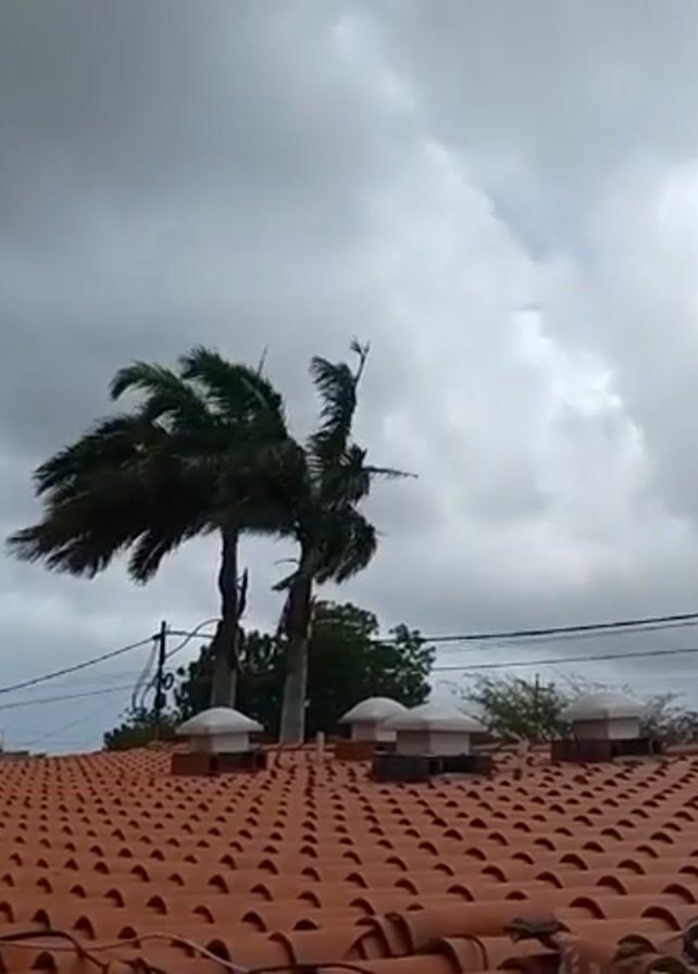 rooftop with reddish-brown tiles, several rounded ventilation units, and other equipment including two blue water tanks and a small satellite dish. Behind the roof, there are two palm trees that are visibly swaying in the wind. Above, the sky is filled with dark, grey clouds. Power lines are strung across the sky in the background. The overall impression is of a stormy or windy day.