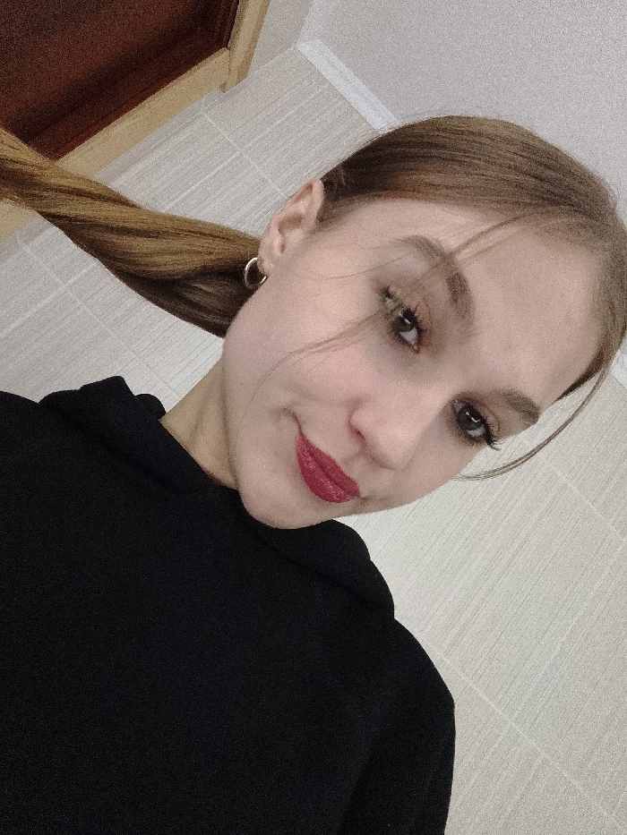 A close-up, slightly tilted portrait depicts a female individual in an indoor setting in Kyiv, Ukraine. The subject has light brown hair styled in a ponytail, with loose strands near her face. Her eyes are enhanced with eyeliner and mascara, and her eyebrows are defined. She wears dark red lipstick and a small silver hoop earring in her visible left ear. Her expression shows a subtle, closed-mouth smile, and she is looking directly into the camera. She is dressed in a black hooded garment. The background includes a light-colored, possibly tiled wall to the right, and a partial view of a dark reddish-brown wooden surface with a lighter trim to the upper left, situated beneath a white crown molding.