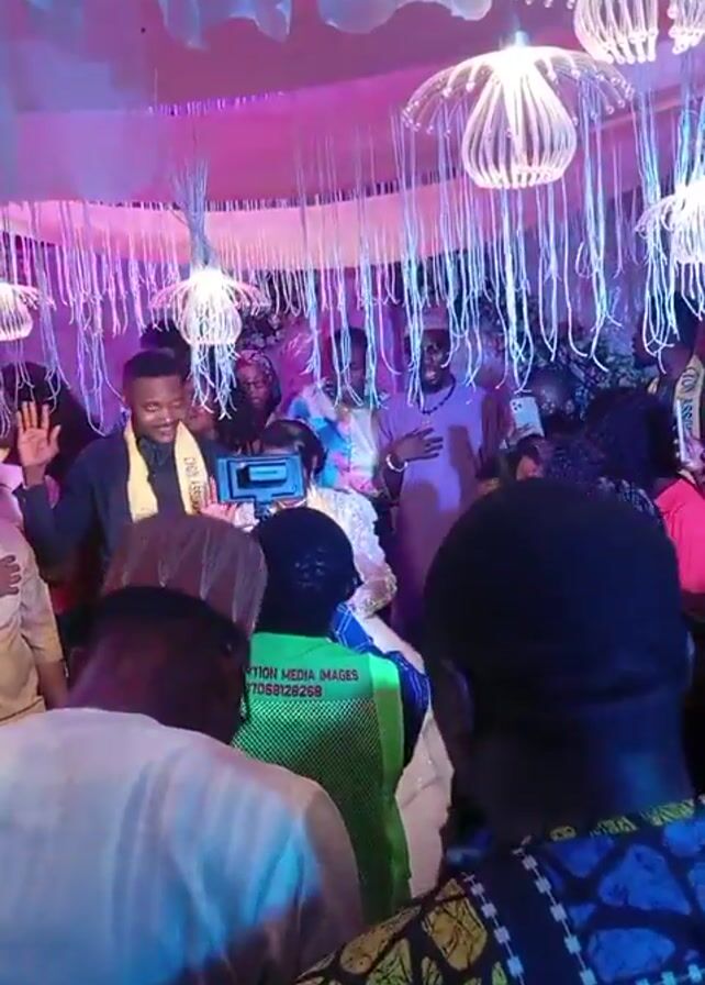 Okay, here's a plain text description of the video: The video shows a lively wedding reception or party. The room is decorated with white fabric hanging from the ceiling, and numerous lit, jellyfish-shaped decorations hanging down. A crowd of people are gathered, with a couple presumably the bride and groom in the center. They are being filmed by someone wearing a green vest with "ASSUMPTION MEDIA IMAGES" printed on the back. The groom is waving, and other people are dancing and singing. The lighting in the room changes color, shifting between pink, white and blue. There is a general celebratory atmosphere.
