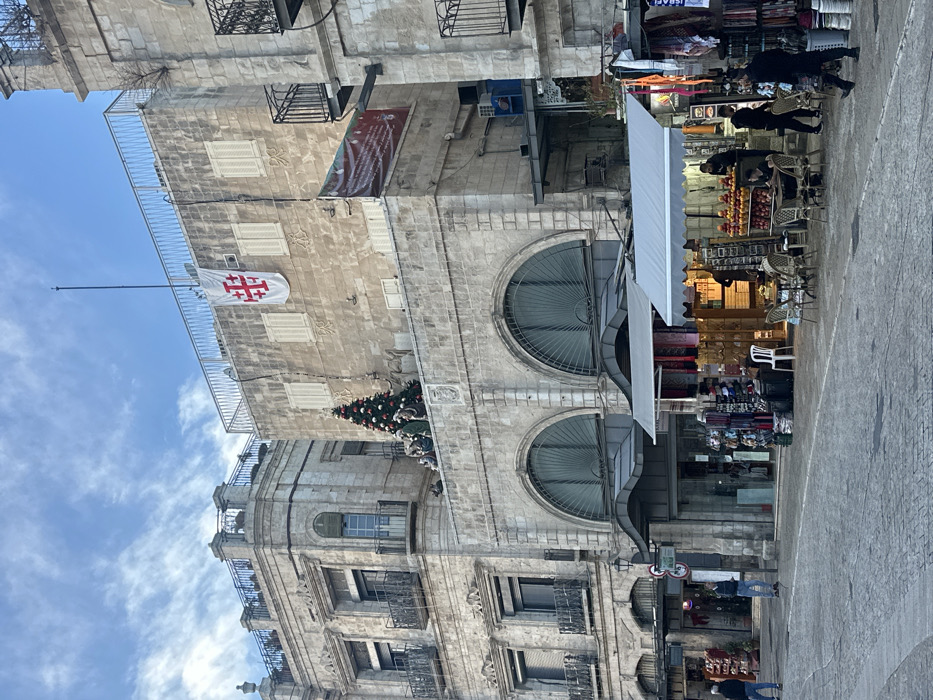 The image depicts a bustling street scene in the Christian Quarter of the Old City of Jerusalem, Israel, specifically near the New Gate or Latin Patriarchate Square