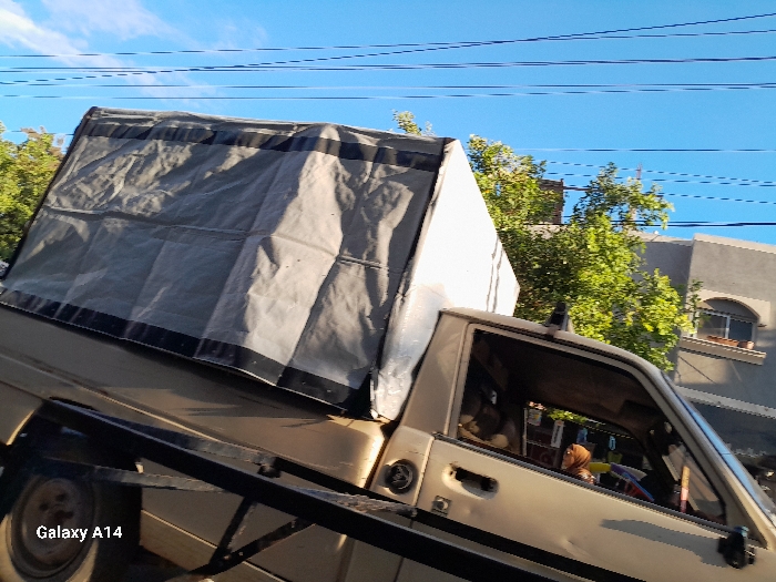 - "A tan-colored truck has a large, boxy canopy over its bed, constructed of gray fabric with dark trim" by FM-V8KrL2, licensed under CC BY 4.0