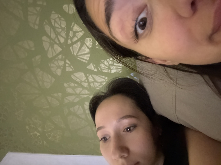 Two women are positioned closely together in a selfie-style image. The top woman's face is angled downward, capturing her eye, eyebrow, and part of her cheek. The bottom woman faces slightly to the left. The background is a patterned wallpaper in a light green shade, with white geometric shapes. The overall lighting is soft and diffused, giving the image a relaxed feel.