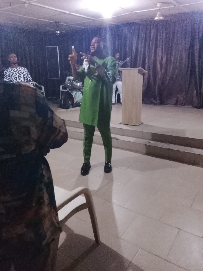 A man in a green suit stands on a stage with a podium, gesturing with his hands. Other people, including musicians with instruments, are visible in the background. The lighting is dim, and the scene appears to be in a room or hall with tile flooring. A white chair and part of a person’s body obstruct the view in the foreground. The backdrop is a dark curtain.