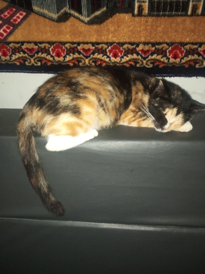 - "In Karwan, India, an image depicts a calico cat sleeping on a dark, textured surface, likely a piece of furniture" by FM-Rb2su2, licensed under CC BY 4.0
