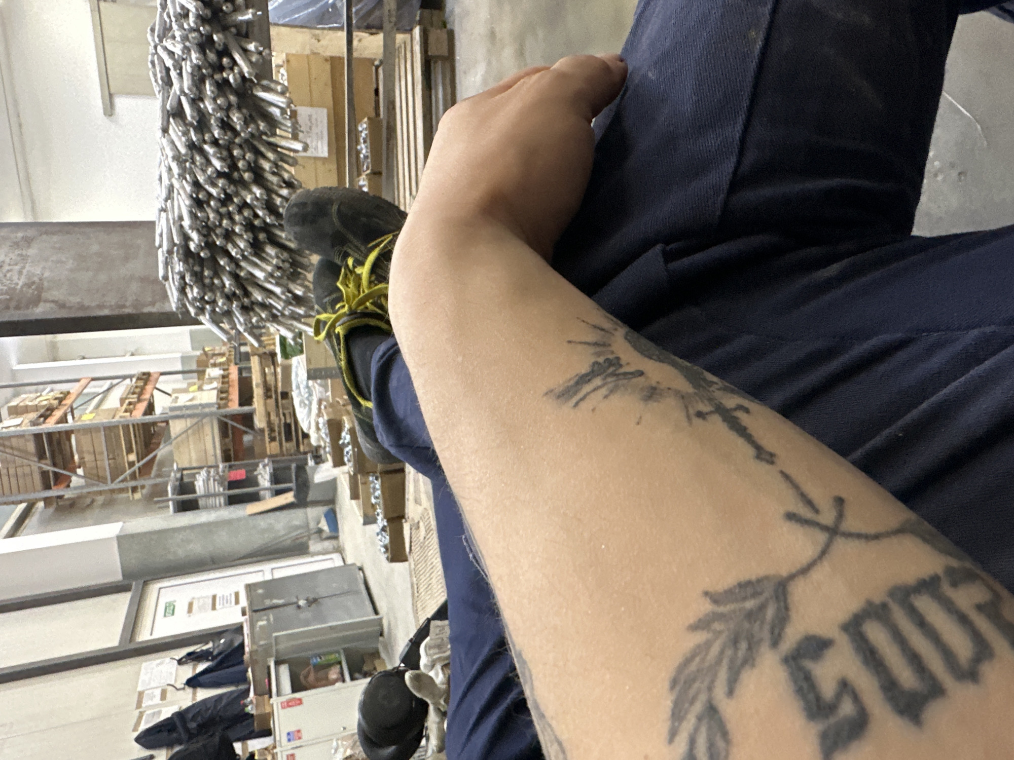 The image depicts a first-person perspective of an individual at rest within an industrial or warehouse environment in Sevlievo, Bulgaria. The subject's legs are elevated, clad in dark blue work trousers and black work boots with bright yellow laces. The right forearm, adorned with multiple black tattoos including text partially reading "SODE" in block letters, a leafy branch, and a sunburst design, rests across the lap. The left hand is also visible, resting on the left thigh. The background reveals a brightly lit interior with a concrete floor and white walls. To the left, a light-colored metal cabinet, a gray two-door metal cabinet, and a white door with notices are visible. Dark garments hang on hooks on the wall, which also has papers taped to it. A broom leans against a metal shelving unit. Further into the background, tall industrial storage racks loaded with wooden pallets and cardboard boxes extend towards the ceiling. In the midground, directly ahead of the subject's feet, a substantial pile of metallic rods or components, uniform in size and appearance, is stacked horizontally on a metal frame. Scattered around the floor and in wooden crates are numerous smaller metallic parts. A black headset or earmuffs and a white glove are on the floor near the left leg.