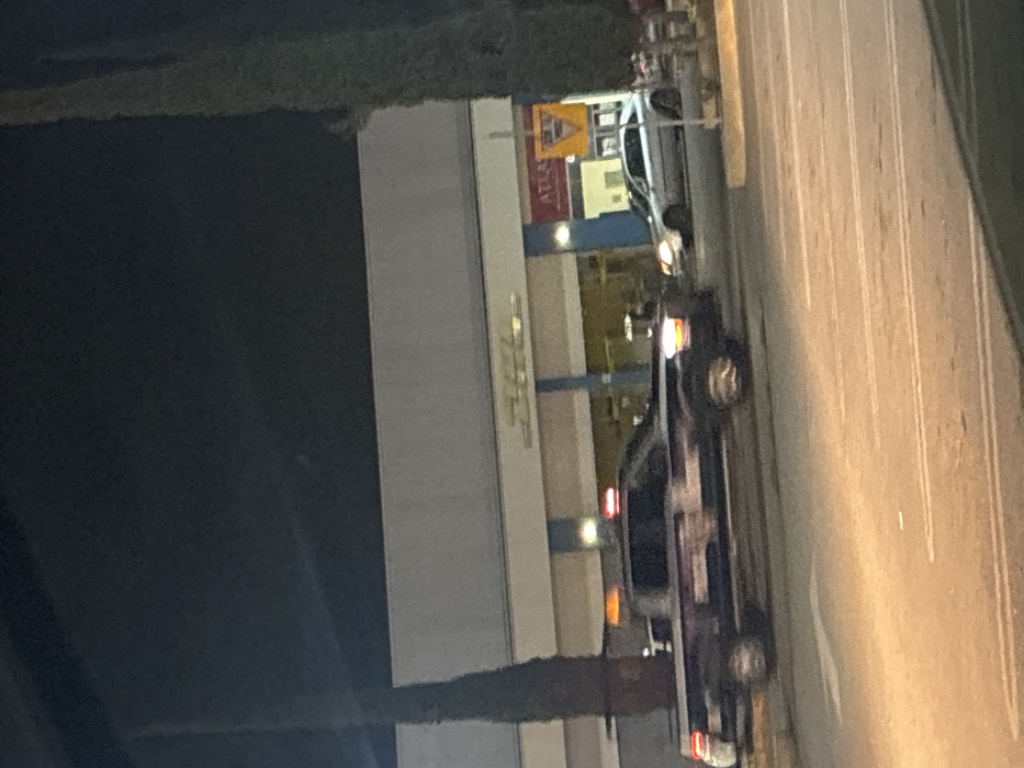 A nighttime shot shows a two-story building with DHL and "ATLAS" signage. Two cars are parked alongside it on the right. The setting appears to be urban, with vegetation visible on the left and above. The image is vertically oriented. The overall lighting is dim, with the cars' lights providing the primary illumination.