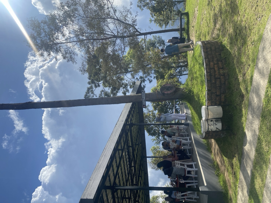 shaded outdoor area with a covered wooden structure supported by black metal beams, located in the city of Kecamatan Tawangmangu, Indonesia (latitude: -7.661, longitude: 111.184). Several people are sitting at tables under the covered area, while two people stand near a stone retaining wall and a tree. A sign with Indonesian writing is visible on the tree. Two white plastic trashcans are near the retaining wall. The grass is green and lush, and there are several trees in the background. The sky is blue and cloudy, with a bright sun shining through the clouds. The scene appears to be a park or a public gathering area. The people are dressed in casual clothing. The image appears to have been taken on a sunny day.