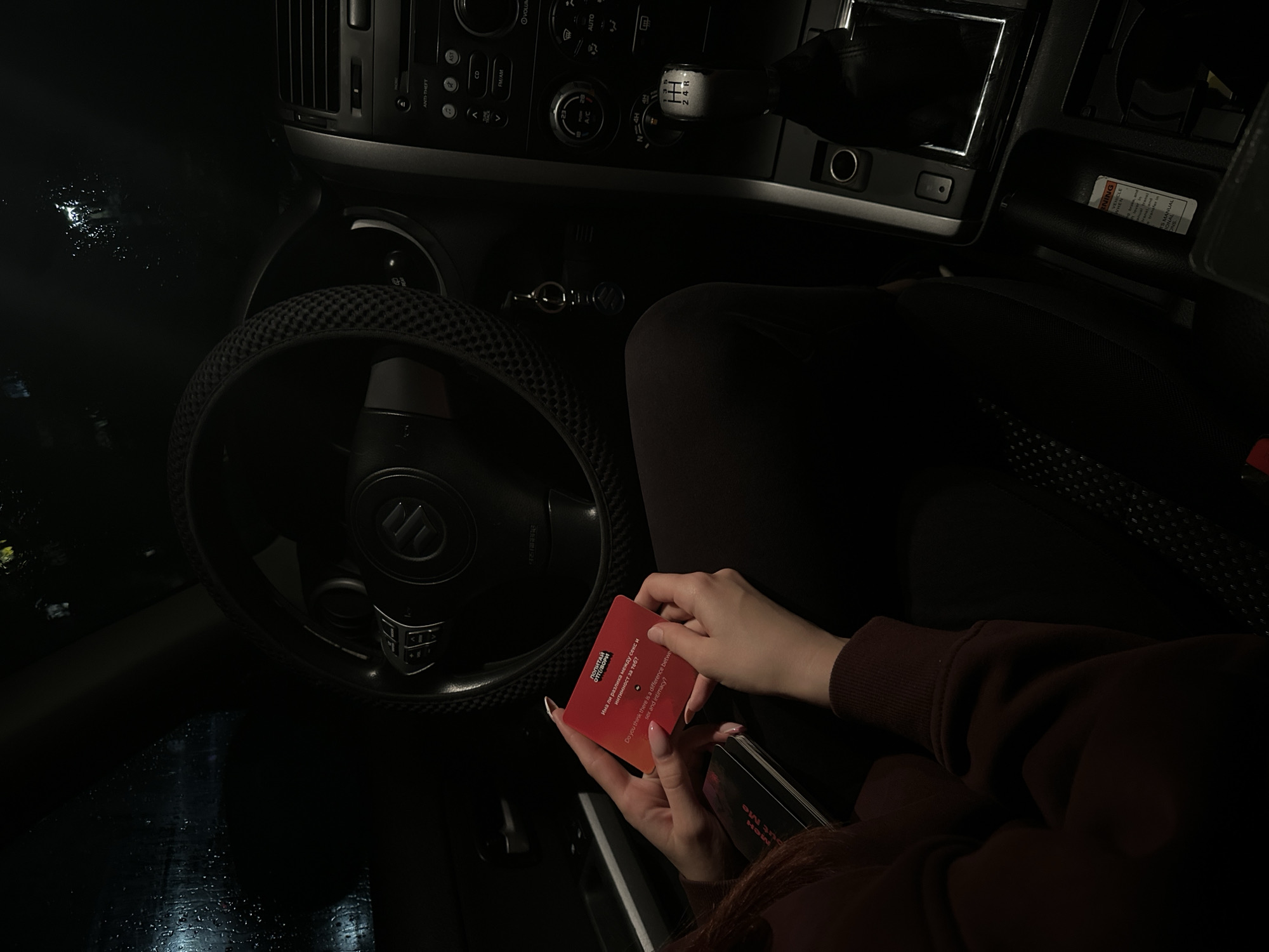 The image depicts an interior car scene at night