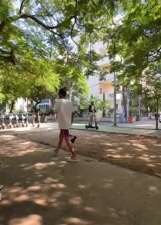man dancing in a park area lined with trees, with scooters parked in the background. The man is wearing a white shirt, red shorts, sandals, and sunglasses. He is moving his arms and legs in a rhythmic fashion. There are other people in the background walking and riding scooters. The park has a dirt path and a green bike lane. The weather appears to be sunny. Buildings are visible in the distance.