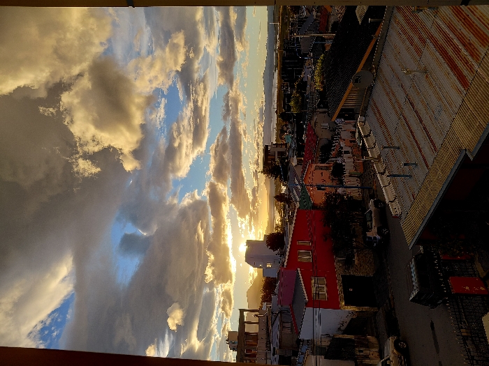 This image depicts an elevated view of a residential section of Ushuaia, Argentina, during a sunrise or sunset. The sky features a dynamic cloudscape with a mix of dark gray, white, and golden-orange cumulus and stratocumulus clouds, interspersed with clear patches of blue. The sun, low on the horizon to the left, is partially obscured by clouds but emits a strong golden glow. In the distance, a body of water, likely the Beagle Channel, is visible, bordered by a low mountain range or hills under the golden light. The midground is occupied by a densely packed urban landscape of residential buildings constructed on a slope. A prominent two-story house in the center-left features a split facade of red and white, with a stone-clad base and a dark garage door. Nearby structures display varied colors, including peach and darker tones. The majority of visible roofs are made of corrugated metal, some exhibiting rust and wear, with numerous vents or pipes protruding. Paved streets are visible, along which several vehicles are parked; a light-colored SUV is parked in front of the red house, and a dark SUV is parked closer to the foreground. Sparse vegetation, including trees and bushes, is integrated between the buildings. The immediate foreground shows a portion of a rusted corrugated metal rooftop with several vertical pipes or vents. Dark vertical structures, consistent with a window frame or balcony railing, are visible on the far left and right edges of the composition. No individuals or active interactions are discernible.