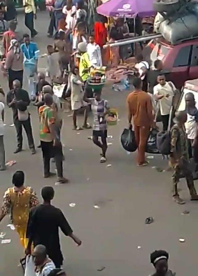 n open-air market scene. There are many people walking around. Some people are carrying bags. There are umbrellas providing shade. Some parked vehicles are visible. The ground is littered with debris. There is a person dressed in military camouflage. There is an audible honk.