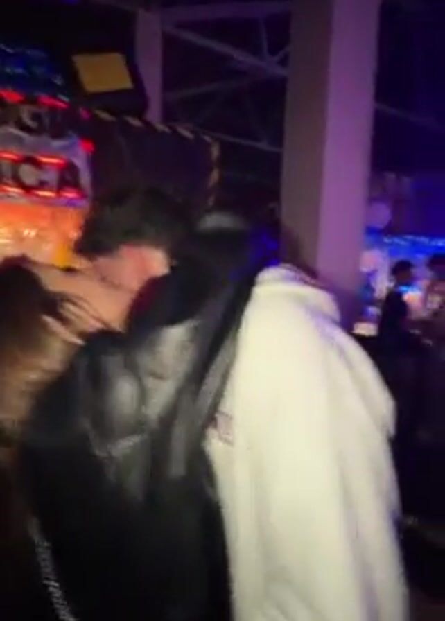 young couple kissing in a crowded indoor space. The woman has long, reddish-brown hair and is wearing a black leather jacket. The man has dark hair, a white hoodie, and a black jacket over it. They are embraced. There are other people around them, blurred in the background. In the background is a sign that says "OLOGÍA MEDICA." The lighting is dim with some blue and green lights. It appears to be some kind of party or event.
