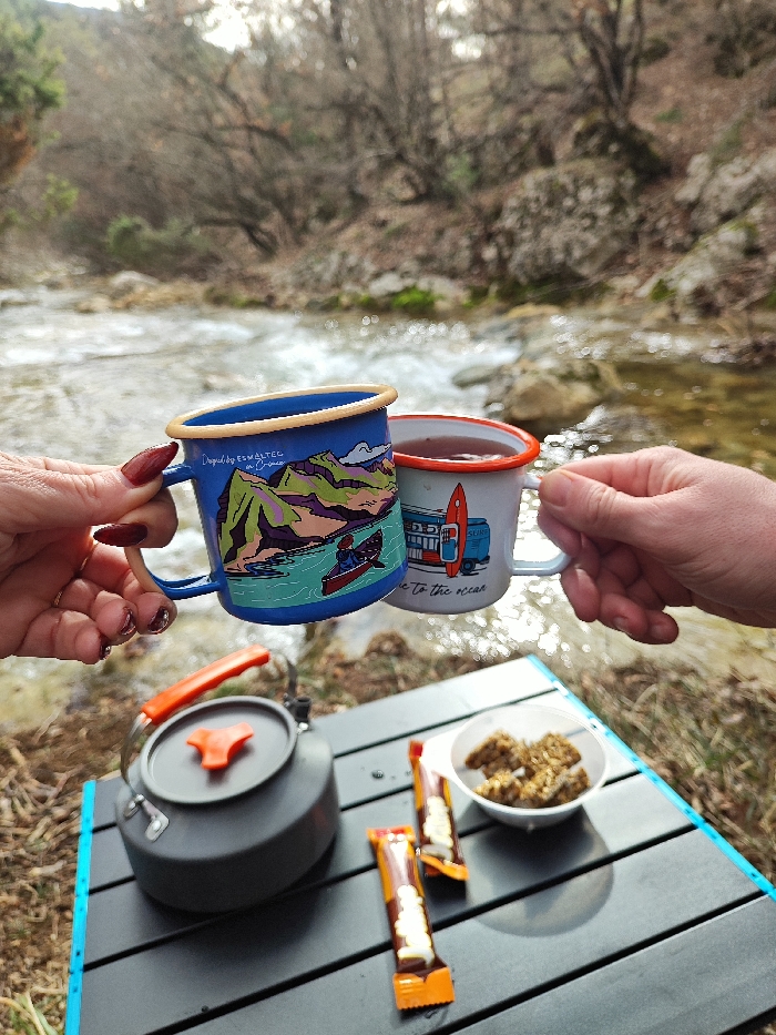 The scene captures two individuals making a toast with enamel mugs in an outdoor environment within Орлиновский округ, Ukraine. A left hand, featuring red nail polish, holds a blue enamel mug decorated with a mountainous landscape and a canoeist. A right hand holds a white enamel mug displaying a surf van and a surfboard. Both mugs contain a reddish beverage. In the foreground, a dark grey folding camping table holds a dark grey camping kettle with an orange handle and an orange knob. Adjacent to the kettle are two individually wrapped chocolate bars with orange packaging and a small white bowl containing a granular snack, consistent with granola. The background reveals a shallow river with flowing water, bordered by rocky banks. The surrounding vegetation consists of sparse deciduous trees, mostly bare of leaves, and some patches of evergreen foliage. The ground is covered with dry leaves and earth.