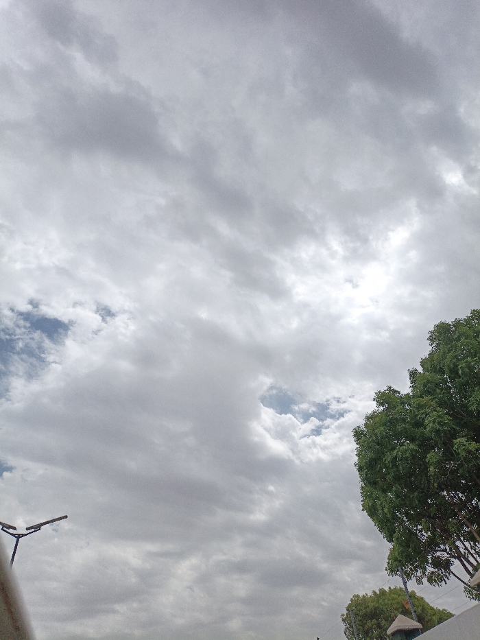 The image captures an upward perspective of an outdoor scene, revealing an overcast sky and surrounding terrestrial features. The sky is largely covered by a dense formation of grey and white clouds, exhibiting stratocumulus characteristics. Patches of clear blue sky are visible through breaks in the cloud cover in the mid-left and mid-right. A bright, diffused light source, presumably the sun, is apparent behind the clouds in the upper-right quadrant. The lower-right portion of the frame is occupied by the dense, green foliage of a large tree, with a smaller section of green foliage visible below it. On the far-left edge, a dark-colored streetlamp featuring a two-pronged fixture extends into the view. A segment of a light-colored wall or structure, topped with a darker capping, is discernible in the bottom-right corner. No individuals or specific interactions are present. The environment suggests an urban or suburban setting. The scene is located in Unknown, Unknown.