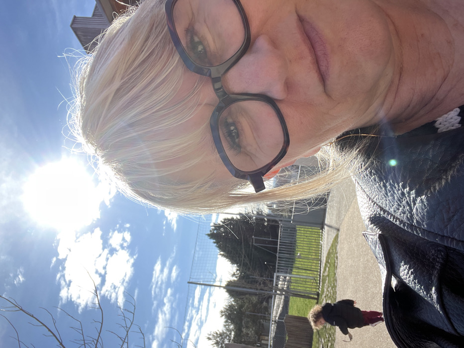 The image depicts an outdoor scene in La Fouillouse, France, under a clear, sunny sky with scattered white clouds. The sun is positioned in the upper center, causing significant lens flare and backlighting. In the foreground, a woman with blonde hair and dark-rimmed glasses occupies the right side of the frame, looking directly towards the camera. She wears a black leather jacket, partially visible on her left shoulder, and a garment with a white patterned design at her chest. A gold-colored earring is visible on her right ear. In the mid-ground, to the left, a young child with curly brown hair is visible, facing away from the camera and towards the left. The child wears a dark jacket and dark red trousers, holding a small stick or object in their right hand. The ground consists of a paved surface where the child stands. Behind the child and extending across the mid-ground is a metal fence, enclosing a grassy area. Beyond the fence, several evergreen trees are present. A light-colored building with dark roof structures is partially visible in the far background on the right.