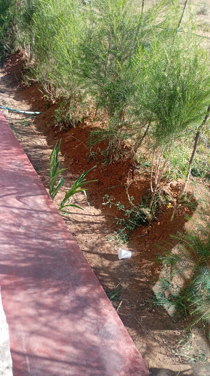 A line of green, shrub-like plants stretches along a red-bordered walkway. Brown soil surrounds the base of the plants, interrupted by patches of green grass and a few taller, broad-leafed green shoots. A blue irrigation hose lies near the base of the plants. A white, disposable cup sits on the ground next to the red walkway. The scene is brightly lit, casting shadows over the walkway.