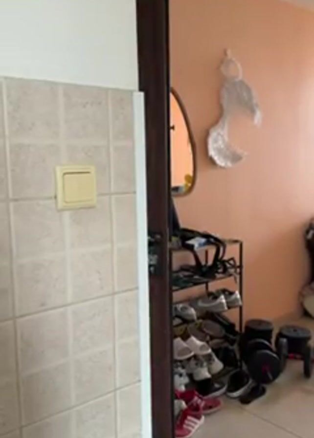 A man with auburn hair, wearing a white t-shirt and black pants, walks out of a doorway holding a bouquet of yellow roses. The flowers are wrapped in white paper and secured with tape. The man is smiling at the camera. The doorway opens into a hallway with peach-colored walls. A shoe rack filled with shoes and an oval mirror are visible in the background. The wall behind the doorway is tiled in a beige pattern, and there is a light switch on the wall.