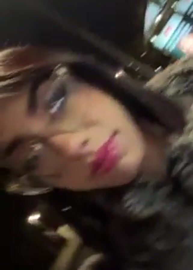 person in a faux fur coat and clear glasses. They have shoulder-length dark hair with bangs and wear pink lipstick. The person is standing near a bus stop at night. The camera moves and is pointed at the person from different angles.