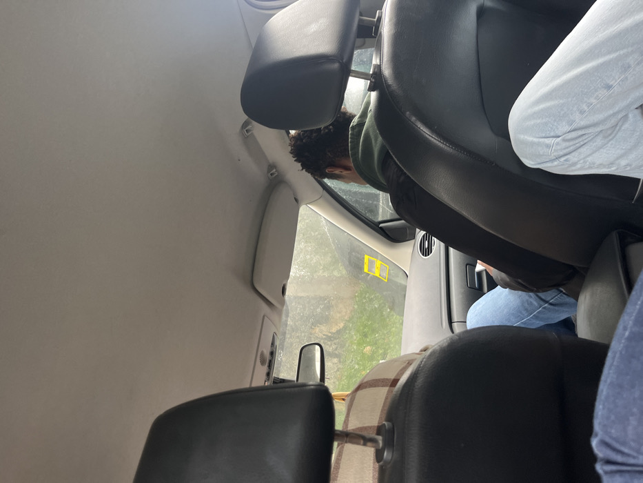 The image depicts the interior of a vehicle, viewed from a rear passenger seat, looking towards the front. The light-colored car ceiling occupies the upper portion of the frame. In the foreground, a dark headrest is prominent on the left, partially obscuring the driver, who is visible wearing a beige and brown plaid garment. To the right, the back of a front passenger's head and torso are visible; this individual has dark, curly hair and wears a dark jacket over a green hooded sweatshirt. Their right hand holds a small white object near their lap. The legs of a third passenger, wearing light blue jeans, are visible in the lower right foreground. Through the front windshield, green vegetation, including trees and grass, is discernible, along with part of a dark vehicle. Two yellow rectangular signs are affixed to the inside of the front windshield on the passenger side. No distinguishing features allow for the identification of a specific location within Lordelo do Ouro e Massarelos, Portugal.