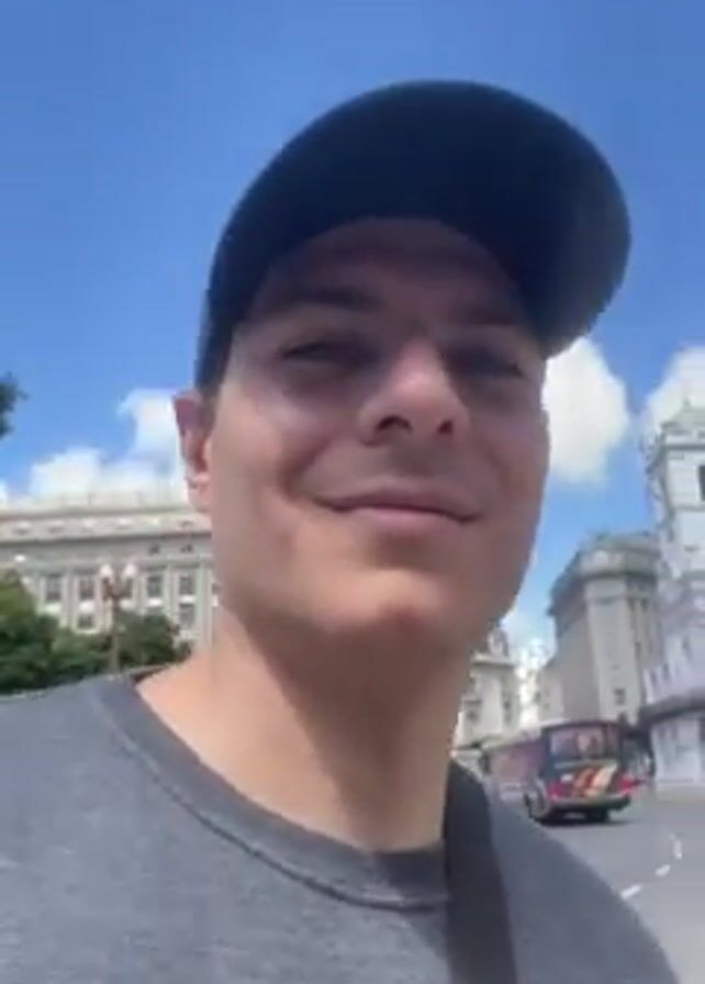 man wearing a gray t-shirt and a black baseball cap standing on a city street corner on a sunny day. He is holding the camera and smiling slightly. Behind him is a large white building, a crosswalk with people crossing, and a yellow tour bus. Traffic passes by on the street. The sky is blue with some clouds.