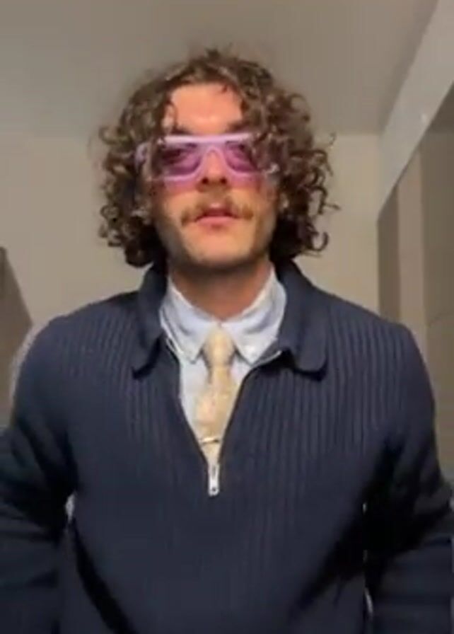 A man with curly brown hair, a mustache, and lavender-framed sunglasses is standing indoors