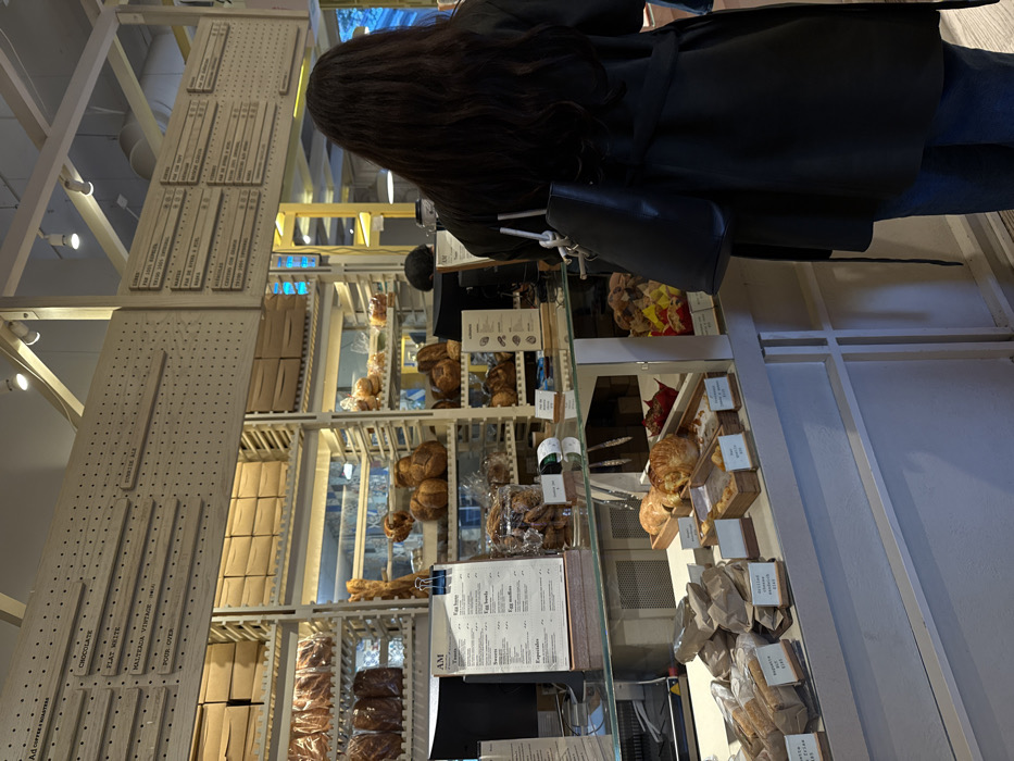 This image depicts the interior of a modern bakery and coffee shop, identified as AD Coffee & Roasters, located in San Pedro Garza García, N.L., Mexico. In the foreground, a person is observed from behind, standing at a white service counter. This individual has long, dark, wavy hair and is wearing a dark, possibly black, long-sleeved coat or jacket over blue jeans. A black shoulder bag with a white strap detail hangs from their right shoulder. The white counter features a glass display case showcasing various baked goods, including croissants, pastries, and bread items, some individually priced in MXN on small wooden labels (e.g., "Baguette $95", "Bolillo cheese $45"). Behind this display, on the counter, rests a clear acrylic menu stand titled "AM," detailing items such as "Tostas," "Egg buns," and "Especiales." Adjacent to it, a large jar of cookies and a small green bottle are visible. A computer monitor and a portion of a coffee machine are also present behind the counter, where a staff member in a dark shirt is partially visible. The background consists of light-colored wooden shelving units meticulously stocked with a variety of bread and pastries, including loaves wrapped in plastic and numerous smaller baked items. The upper shelves are occupied by stacks of brown cardboard boxes. Above the counter and shelving, several large wooden pegboards serve as menu displays. The pegboard on the left lists "AD Coffee & Roasters" at the top, followed by beverage options like "CHOCOLATE," "FLAT WHITE," "MALTEADA VINTAGE (MXN)," "POUR OVER," and "SUNRISE ALE." The pegboard on the right displays food items, some with prices, such as "PAN DE AZUCAR," "PAN DE AVENA Y MIEL," "EMPANADAS," "CENTENO CON NUECES," and "SCONES." Overhead spotlights provide bright illumination throughout the establishment. The overall environment appears clean, organized, and well-lit.