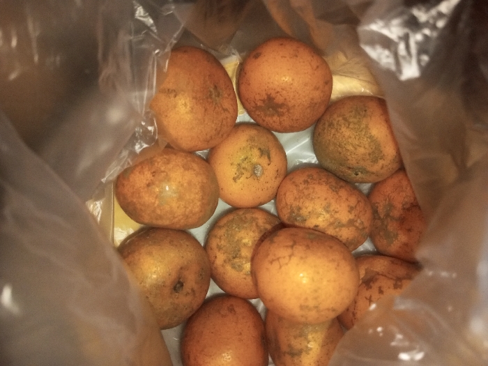 The image displays approximately 15 to 20 oranges contained within a translucent, crinkled plastic bag, viewed from a top-down perspective. The oranges are spherical to ovoid, exhibiting an inconsistent orange coloration interspersed with significant areas of greenish-brown discoloration and numerous dark blemishes on their skins. They are densely packed at the bottom of the bag, resting on an obscured light-colored surface. The plastic material partially frames the composition, with folds visible. The lighting is dim and uneven. No individuals, actions, or further environmental details are discernable beyond the immediate contents of the bag. This scene is located in Bagochen Boolingpang Ueling, Bhutan.