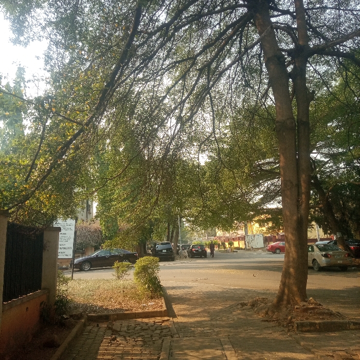 The image depicts a tree-lined street scene in Abuja, Nigeria, observed from a low vantage point