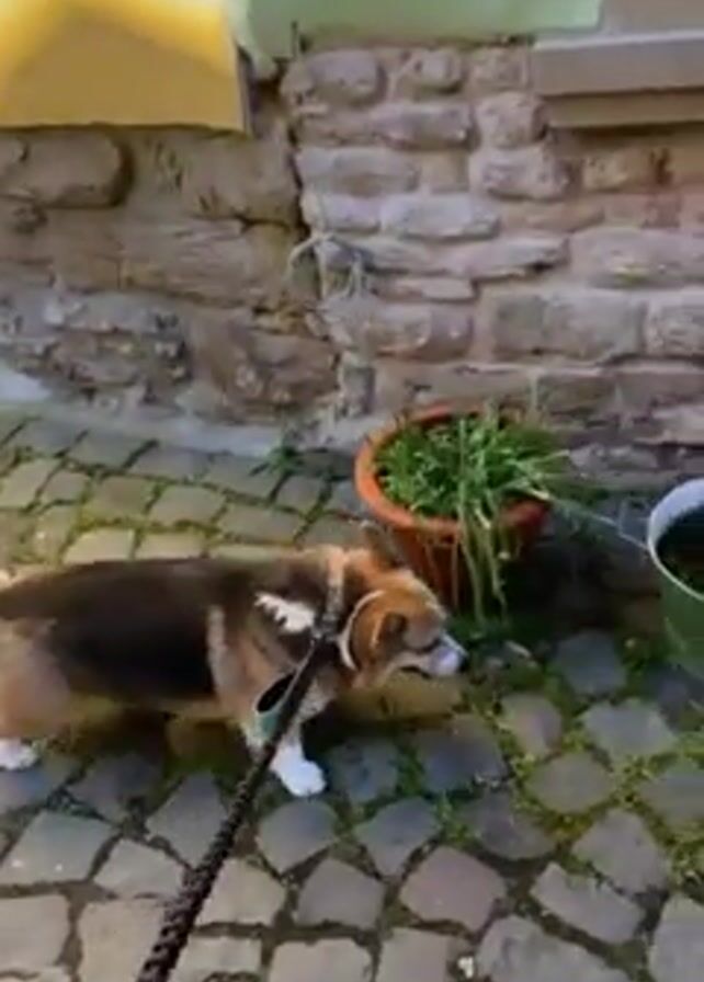 medium-sized dog, resembling a corgi mix with brown, black, and white fur, on a black leash. It walks on a cobblestone path next to a stone wall. There are potted plants along the wall. The dog is sniffing the ground and the vegetation. The background includes a window and painted surfaces, one yellow and one white. The camera follows the dog as it moves.