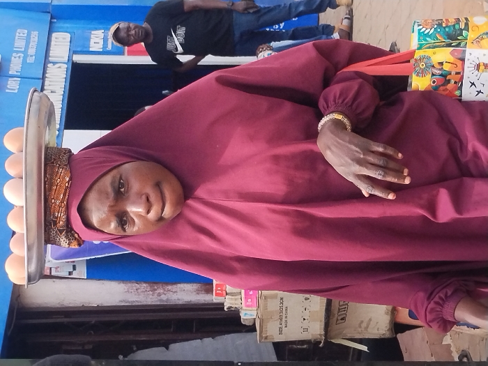 A woman in a maroon hijab carries a silver tray of eggs on her head