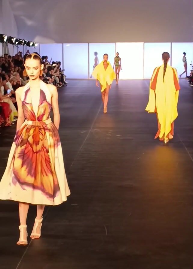 fashion show. Four female models are walking down a black runway. The closest model is wearing a light-colored dress with an orange, yellow, and maroon floral print. The dress has a halter top and goes down to the knees. She is wearing light-colored wedge shoes. The second model is wearing a bright yellow, short cape-like outfit. The third model is wearing a green bathing suit with a yellow trim. The fourth model is wearing a long yellow robe-like outfit with a red lining. All of the models are walking toward a wall of light. The models are walking in front of a crowd of people who are sitting and watching the show.