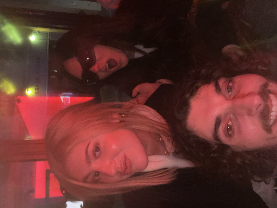 A dimly lit selfie captures three individuals indoors, primarily illuminated by red ambient light with scattered yellow-green highlights