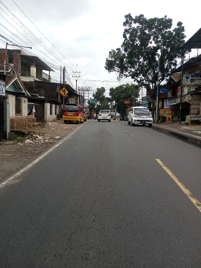 This image depicts a two-lane asphalt road in Khajuripada, India, under an overcast sky. The road features a broken yellow line on its right side and a solid white line on its left. On the left side of the road, a dirt shoulder with scattered debris and several wooden cages borders a row of one to two-story buildings. Overhead, numerous power lines are strung between utility poles. A yellow road sign indicating a Y-junction or turn ahead is visible. A red and yellow van is parked on the shoulder further down. On the right side of the road, a raised curb separates the pavement from a row of commercial buildings. A white compact multi-purpose vehicle (MPV) is parked partially on the curb. A large, leafy green tree stands prominently, partially obscuring buildings. Several commercial signs are visible, including one for "APOTEK 99 Farmasi." Traffic consists of a white compact MPV traveling away from the viewer in the middle of the road, with another white vehicle and a motorcycle or scooter visible further in the distance. No pedestrians are clearly visible, and no specific actions or interactions are discernible among the limited subjects.
