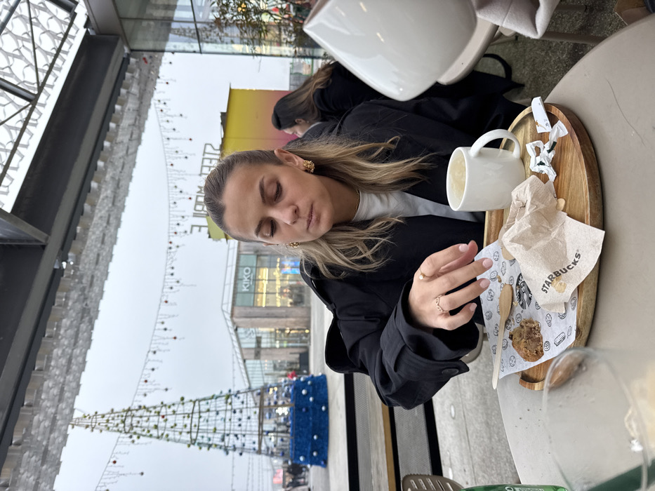 An outdoor scene captures a female individual at a table in a plaza identified as the Steel Mobile shopping center in Saint-Jean-Bonnefonds, France. The primary subject, a female with light brown hair tied back, is seated, wearing a dark trench coat over a white top. She has gold-colored earrings and two rings on her left hand. Her mouth is slightly open, and she appears to be chewing, with her left hand positioned above a wooden tray on the table. On the light-colored round table, a wooden tray holds a partially eaten cookie or muffin fragment, a small wooden spoon, a crumpled brown Starbucks napkin, and other discarded wrappers. A white ceramic mug containing a light-colored liquid is present to the right of the tray. To the far left, a clear glass with ice and a green straw is partially visible. Another female with dark hair is partially visible sitting at a separate table in the mid-ground. The background reveals a large, cone-shaped Christmas tree structure adorned with blue and green ornaments, resting on a blue base. Overhead, strings of decorative lights with small red and green ornaments are visible. Several buildings are in the background, including one with "KIKO" visible on its facade and another with a yellow facade displaying a mirrored "STREET MOBILE" sign, indicating the "Steel Mobile" complex. The sky is overcast, and the area is covered by an architectural canopy featuring a patterned metal structure. Indistinct figures populate the wider plaza area.