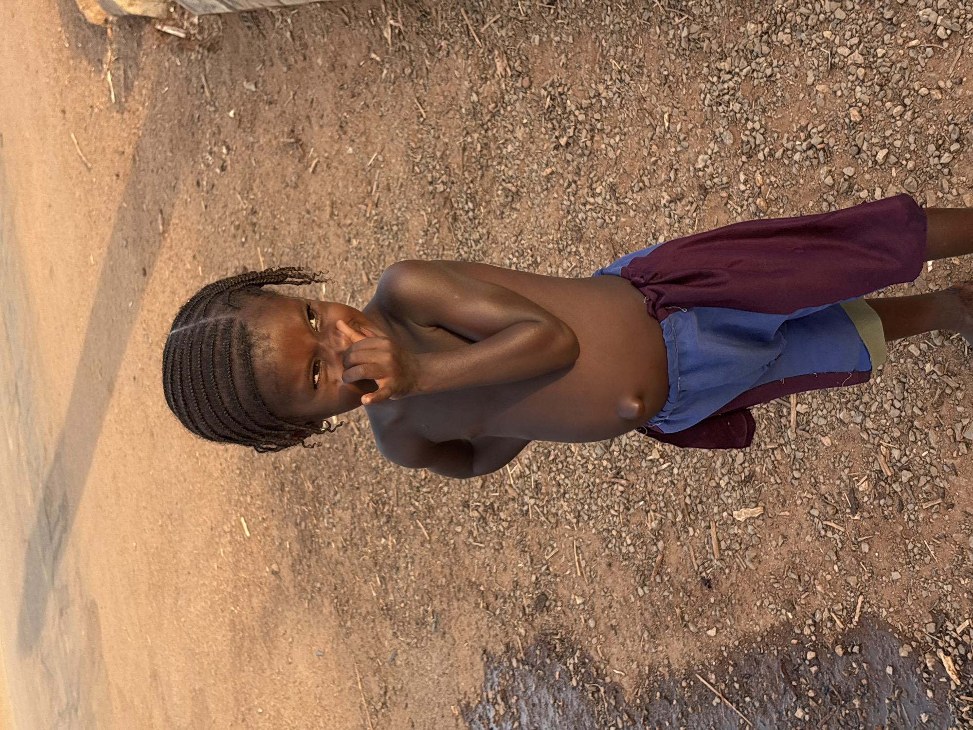 A young, dark-skinned child stands on a reddish-brown dirt and gravel surface in Lafia, Nigeria. The child has braided hair and is clothed in blue shorts with a maroon fabric section tied or wrapped around the right side; the upper torso is bare, displaying an umbilical hernia. The child's right hand is raised, partially obscuring the mouth and nose, while the left hand rests on the hip. A small earring is visible on the left earlobe. The child looks towards the viewer with a subtle facial expression. The ground to the left features a dark, damp patch. In the background, a lighter dirt path and a partial concrete curb are visible. A long, dark shadow extends across the upper portion of the scene. The ambient light is warm and indirect.