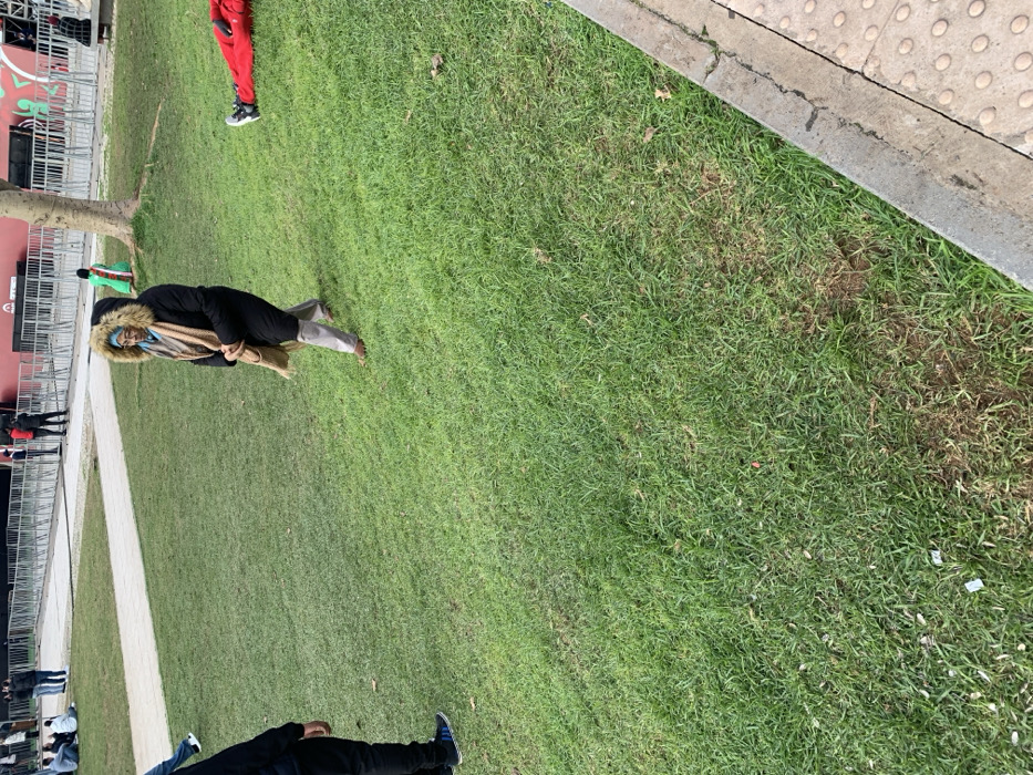 A grassy area hosts several individuals. One person, dressed in a black coat with a fur-trimmed hood and a scarf, is seated on the grass. Another person, clad in red, is visible further away. Additionally, another person is wearing a black coat and blue sneakers. The setting appears to be a park or outdoor space adjacent to a building.