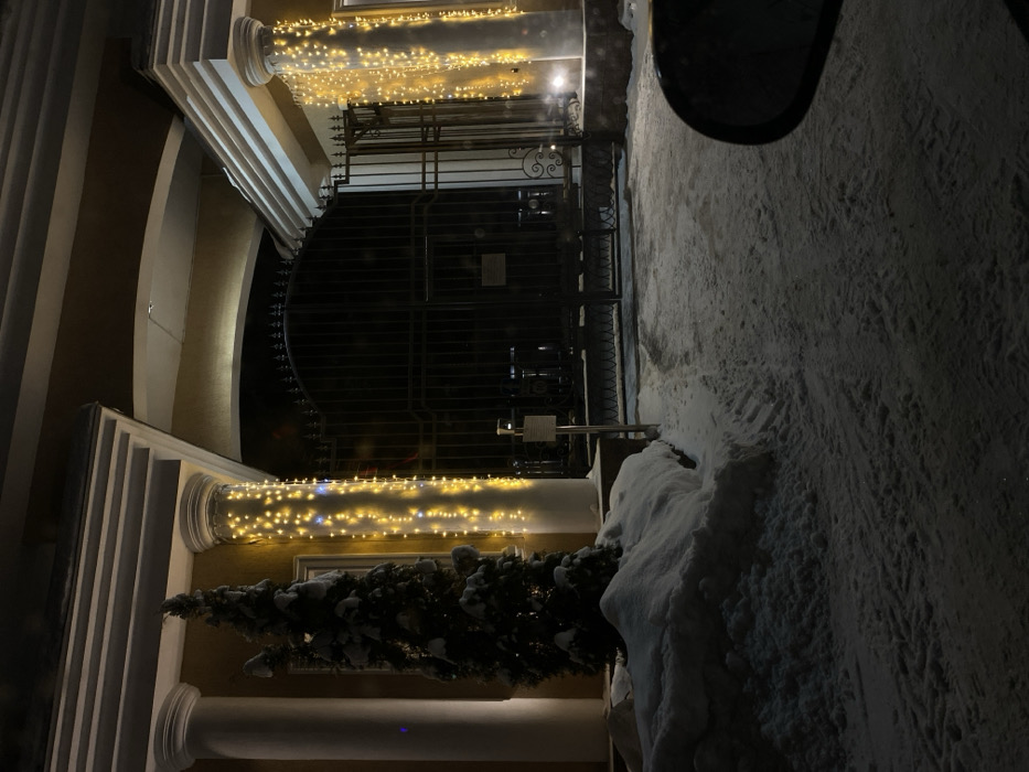 A wintry scene features an ornate gated entrance illuminated by strings of lights. Snow covers the ground and a small tree, suggesting a festive atmosphere. The architecture showcases classic columns and archways. Part of a car mirror is visible at the top right. The image appears to be taken at night with dark surroundings.