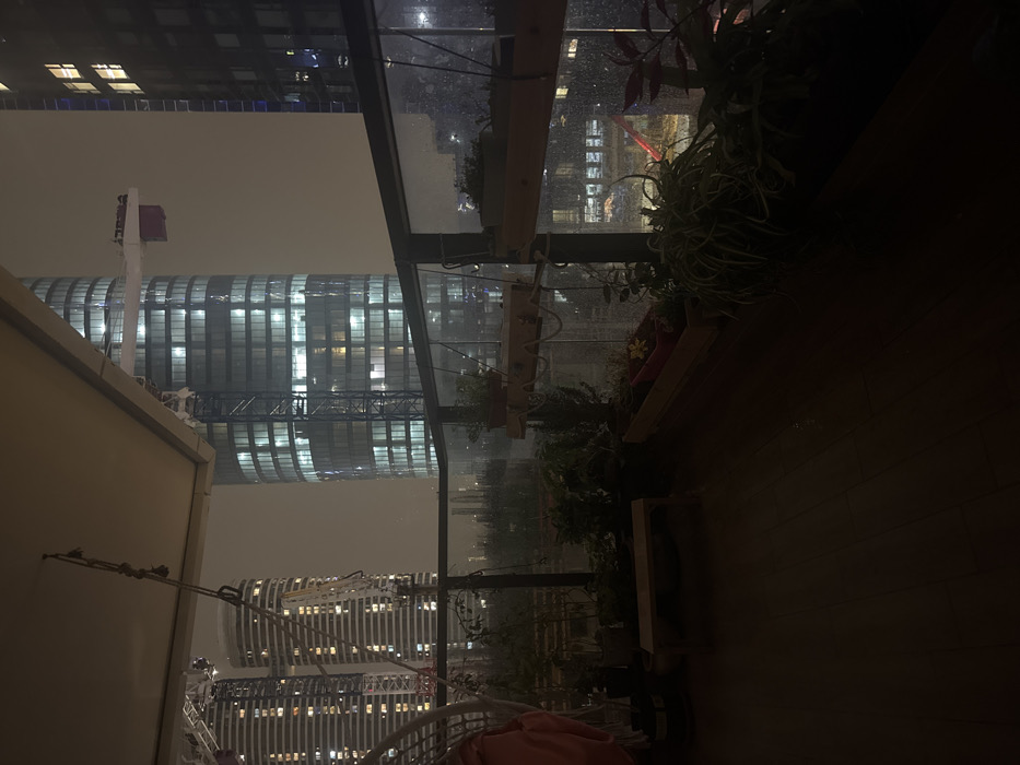 Night view from a high balcony shows skyscrapers obscured by fog. Lights illuminate their curved facades, reflected in the glass balcony structure. Plants line the balcony, creating a blurred foreground, contrasting with the sharp lines of the buildings beyond. The dark wooden floor of the balcony stretches into the right side of the frame.