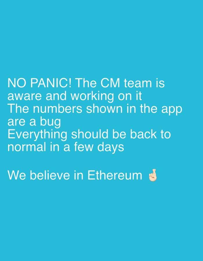 The image is a bright cyan square with white text in the center. The message reads "NO PANIC! The CM team is aware and working on it. The numbers shown in the app are a bug. Everything should be back to normal in a few days. We believe in Ethereum." A fingers-crossed emoji appears next to the word "Ethereum". The message appears to be an announcement indicating a problem with an app is being resolved.