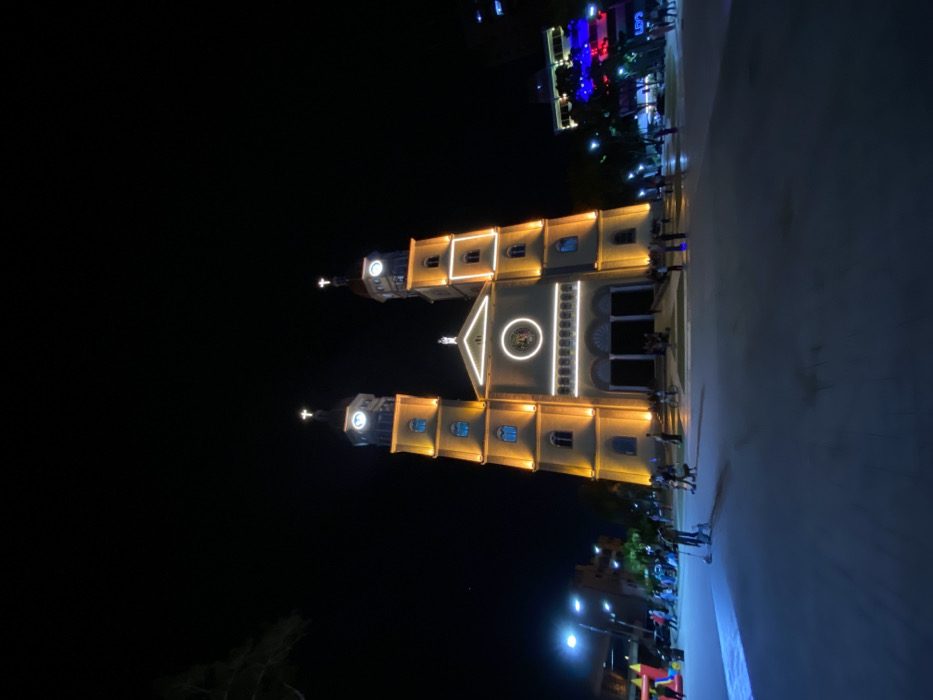 A brightly lit church stands tall in the night. The building features two towers adorned with crosses, and the structure is illuminated with glowing yellow lights and white neon accents. People gather around the base, and the ground reflects the light, creating a luminous effect. Streetlights dot the surrounding area, while dark sky provides a dramatic backdrop.