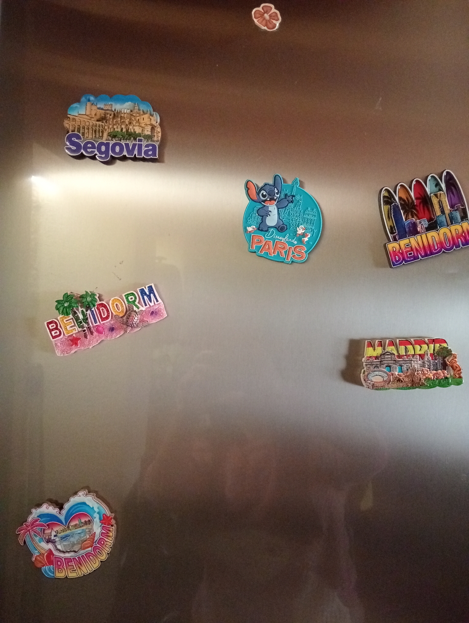 The scene depicts a brushed stainless steel surface, likely a refrigerator door, located within a residence in Piedrahíta, Spain. Seven distinct souvenir magnets are affixed to this metallic surface. Positioned on the top left is a rectangular magnet featuring "Segovia" text above a relief depicting the city's aqueduct and associated architecture. Above the center, a small, reddish-brown, five-petaled flower magnet is present. To the left of center, a circular, light blue magnet displays Disney's Stitch character with "Disneyland Paris" text. Upper right features an elongated "Benidorm" magnet composed of five vertical, stylized surfboard shapes, each illustrating elements like palm trees and buildings. Below the "Stitch" magnet, a second "Benidorm" magnet displays colorful block letters, two green palm tree reliefs, a pink glittered base, and a small sea turtle figure. Below the surfboard "Benidorm" magnet, a "Madrid" magnet is visible, featuring the city name in yellow and red, superimposed over miniature reliefs of city landmarks including a bullring and a statue of a bear and strawberry tree. Lastly, at the bottom left, a heart-shaped "Benidorm" magnet illustrates a beach scene with palm trees, boats, and distant buildings. The stainless steel surface reflects ambient light, with a prominent bright highlight on the left side and subtle, indistinct reflections suggesting an indoor setting. No individuals or active interactions are present in the frame.