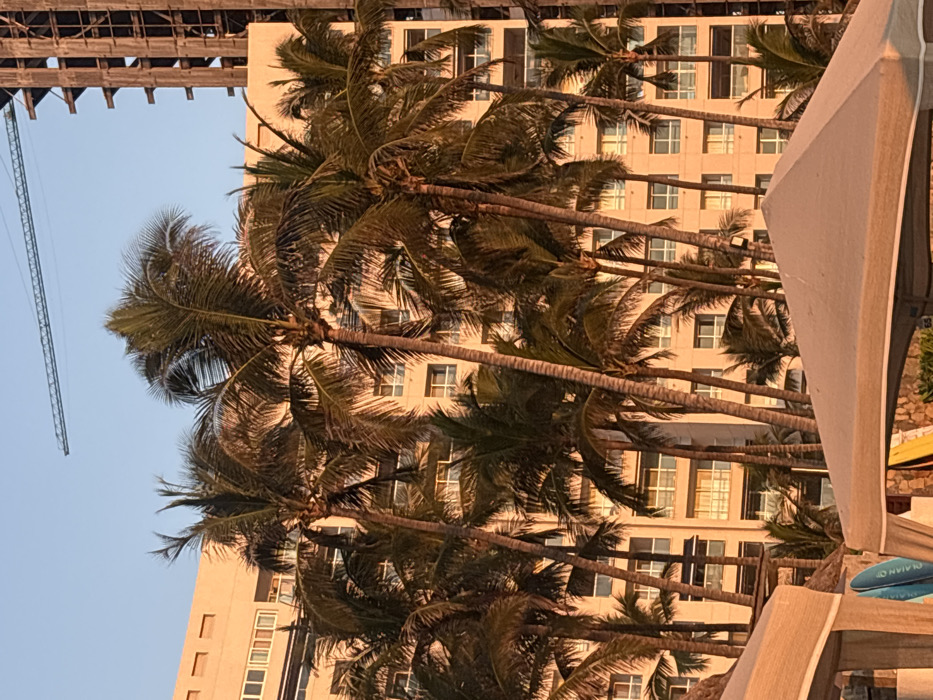 several palm trees in front of a tan-colored building with multiple windows. A tall crane is visible in the upper left corner against a blue sky. The foreground features a white tent structure and a stack of blue beach items. The perspective is slightly tilted, giving a dynamic feel to the scene, and the light suggests it might be late afternoon or early evening.