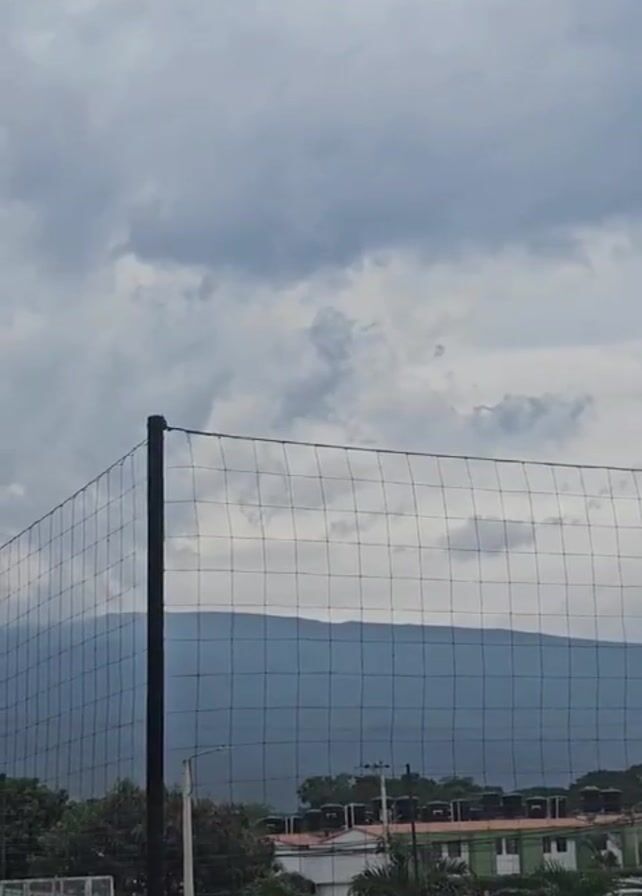 view through a chain-link fence. Behind the fence are trees, buildings, and a mountain range. The sky is overcast with dark clouds. The camera slowly tilts upwards, focusing on the sky.
