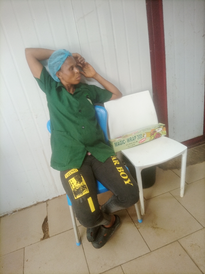 An adult female is seated on a blue plastic chair, leaning against a white corrugated wall, in Opete, Nigeria
