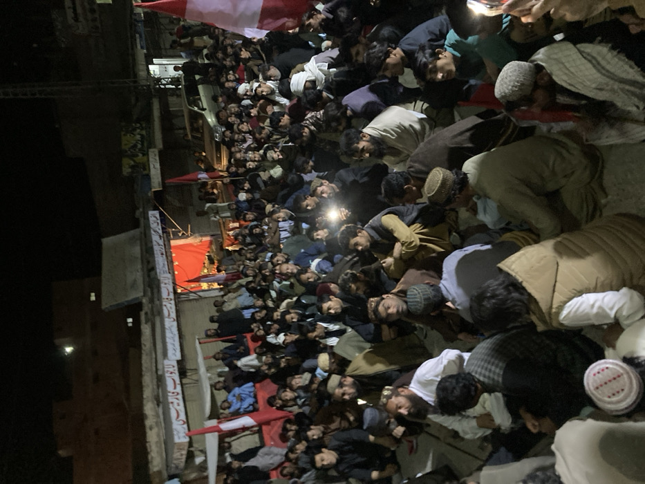 An outdoor nighttime gathering is depicted in a street or open area in the city of Qilla Saifullah, Pakistan