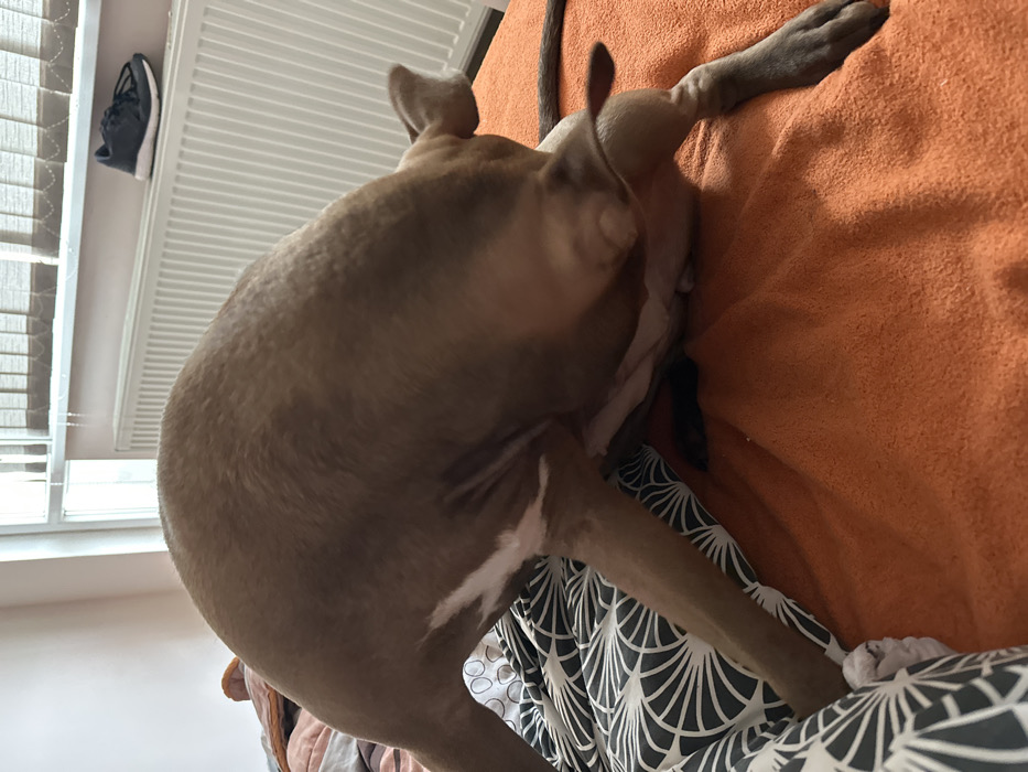 The image depicts an indoor scene within the city of Malevo, Bulgaria. A medium-sized, short-haired dog, brown in color with white markings on its underside, is positioned on a bed or sofa. The dog is actively engaged in self-grooming, with its head bent backward towards its hindquarters, appearing to lick or scratch its rear flank. The surface beneath the dog is covered by a black and white geometric-patterned duvet on the left and a solid orange blanket on the right. In the background, a window with horizontal blinds is visible, below which a white panel radiator is mounted. A single black athletic shoe is resting on the top surface of the radiator.